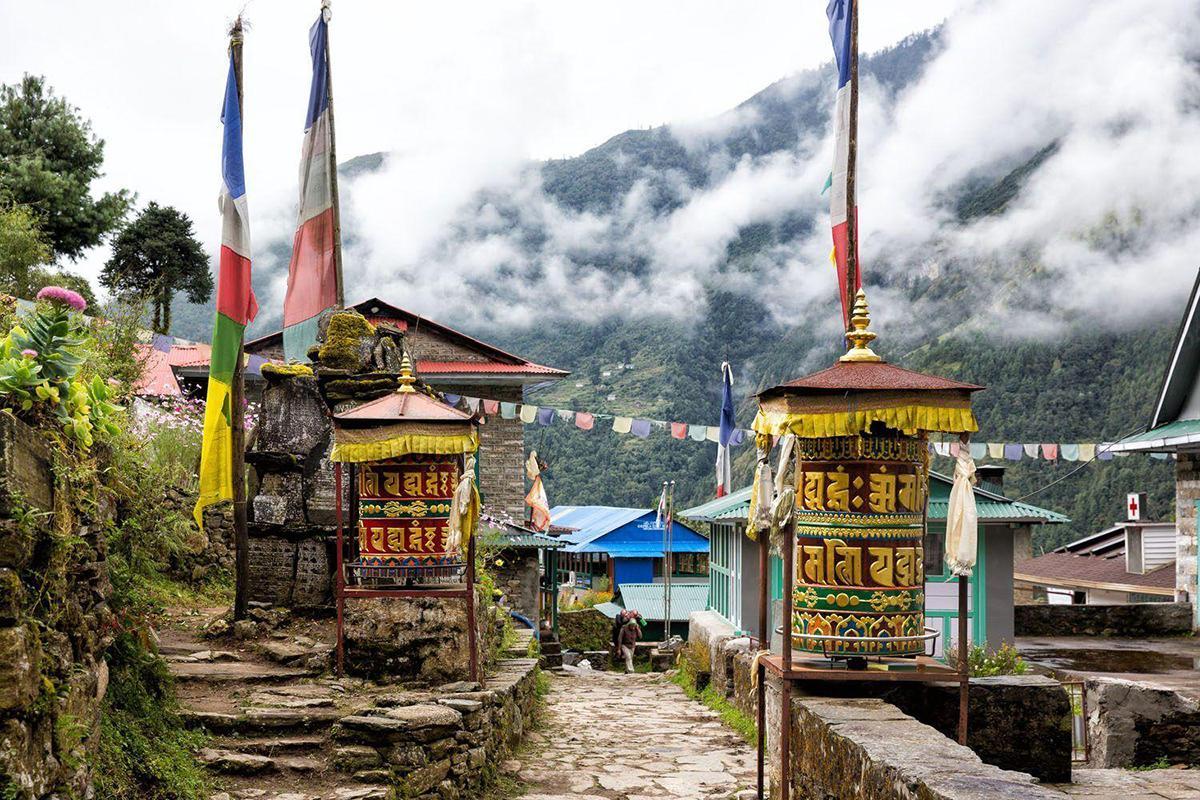 Highlights: Scenic flight, Sherpa villages, prayer wheels, mani stones.